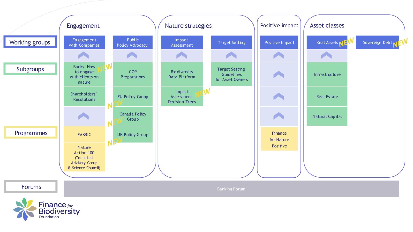 The Finance for Biodiversity Foundation provides its members with collaborative and pre-competitive (online) platforms to advance biodiversity integration in financial decision-making. Within these platforms, financial institutions gain knowledge, co-develop guidance, share best practices, and deliver tangible progress for biodiversity. Our working groups are coordinated through a bottom-up model led by member co-chairs and the FfB Secretariat.